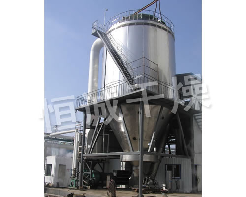空氣經(jīng)過濾和加熱,進入干燥器頂部空氣分配器,熱空氣呈螺旋狀均勻地進入干燥室。料液經(jīng)塔體頂部的高速離心霧化器,(旋轉)噴霧成極細微的霧狀液珠,與熱空氣并流接觸在極短的時間內可干燥為成品。成品連續(xù)地由干燥塔底部和旋風分離器中輸出,廢氣由風機排空。